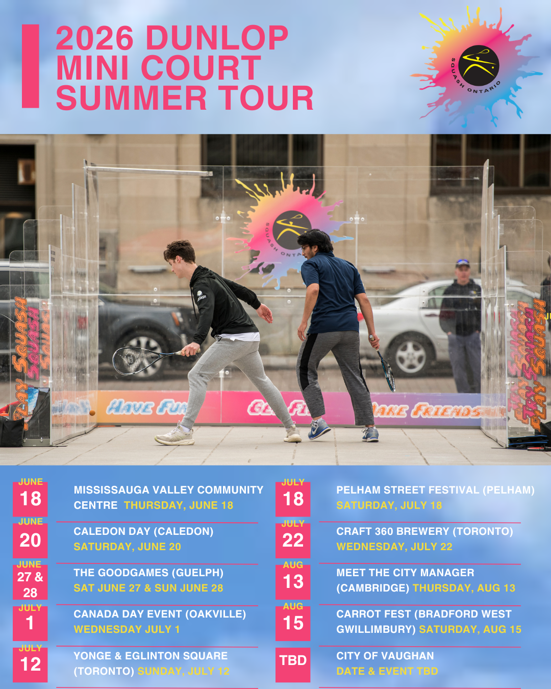 Get ready, Ontario — the Dunlop Mini Court Summer Tour is back for Summer 2026, and plans are already in motion for another exciting season of bringing squash straight into communities across the province.